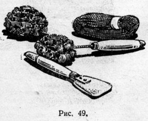 В магазинах хозяйственных товаров продаются для мытья посуды специальные щеточки, скребки и мочалки из бумажной и металлической стружки (рис. 49).
