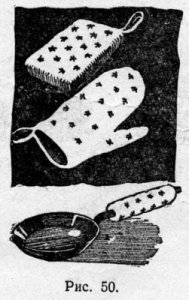 Снимая с плиты горячую посуду (кастрюлю, кофейник, чайник и др.), не рекомендуется пользоваться первой попавшей под руку тряпкой или куском бумаги. Для этой цели следует сделать прихватки квадратной формы или в виде рукавички. Для сковороды можно сшить специальную прихватку (рис. 50).