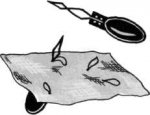 Зацеп на лицевой стороне одежды удобно устранять при помощи приспособления для вдевания нити в иглу. Кончик приспособления нужно продеть с изнаночной стороны ткани, болтающуюся нить вдеть в проволочную петлю. Чтобы завершить ремонт, остается вытянуть нить на изнаночную сторону.