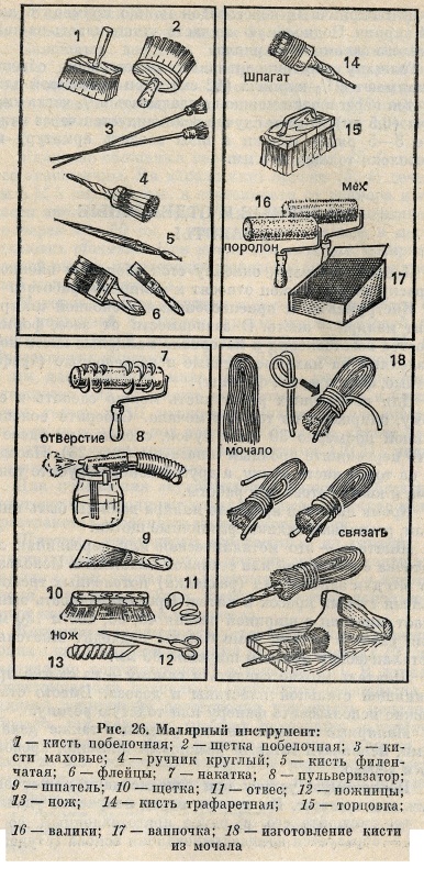 Инструменты и приспособления. Основной инструмент маляра — кисть. В зависимости от веса, формы, способа изготовления и материала малярные кисти подразделяют на маховые, ручные и разделочные (трафаретные, филенчатые, флейцы).