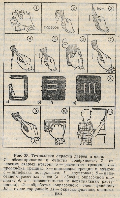 Окрасочные работы следует проводить в следующем порядке: очистить от загрязнений рабочую поверхность; снять старые наплывы краски, счистить вздувшийся слой; разрезать трещины ножом; проолифить трещины; прошпаклевать поврежденные места масляно-клеевой шпаклевкой; отшлифовать отремонтированные места шкуркой; огрунтовать выправленные места; окрасить все плоскости за один раз основным тоном и дать слою высохнуть; покрыть плоскости вторым слоем; обработать покрасочный слой флейцем или торцовкой; при необходимости обвести филенки другим колером; дать высохнуть поверхности.