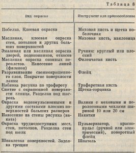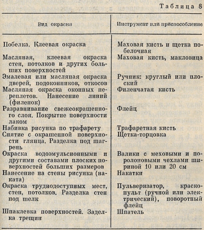 Итак, инструмент подобран, пол надежно укрыт, приступайте к работе. При этом пользуйтесь инструментом в зависимости от проводимой отделочной операции (рис. 26, табл. 8), также клей и красящие вещества-пигменты, например синьку. В последнее время широкую популярность приобрела водоэмульсионная поливинилацетатная краска, обладающая рядом достоинств: она быстро сохнет; поверхности, покрытые ею, можно мыть; она пригодна для окраски по штукатурке, бетону, кирпичу.