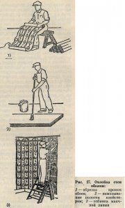 Отделка поверхностей пленкой и самоклеящимися обоями. Пленка хорошо ложится на стену или дверь, если ее поверхность тщательно выровнена, покрыта олифой, прошпаклевана, зачищена шкуркой, просушена и протерта от пыли.