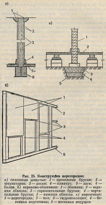 Сплошные перегородки (рис. 25 а) изготовляют из досок (3) толщиной 4—5 см, которые покрывают штукатуркой (2) или обшивают древесноволокнистыми плитами, фанерой или листами сухой гипсовой штукатурки. С целью повышения жесткости доски соединяют между собой деревянными круглыми шипами диаметром 1 см и длиной около 10 см. Шипы вставляют в доски на клею с шагом по высоте 1—1,5