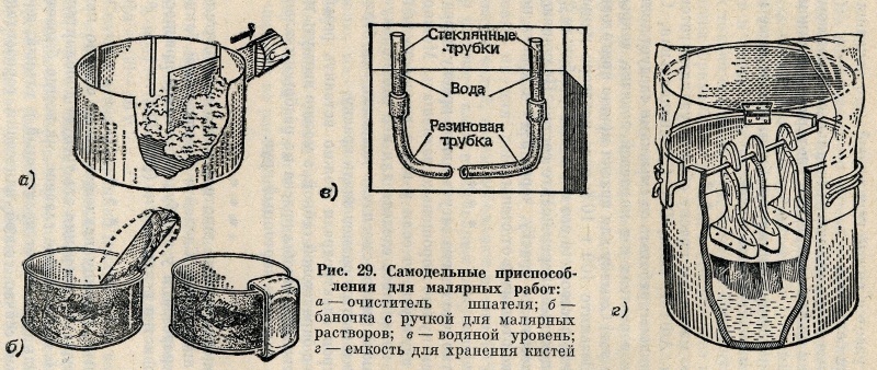 Верхнюю границу наклейки обоев обычно намечают по шнуру. Но операция эта требует дополнительных измерений и, что самое главное, не всегда бывает точной. А ведь существует практичный и точный, почему-то забытый сейчас способ нанесения горизонтальных линий. На рис. 29 в изображен водяной уровень, сделанный из двух трубок и шланга.