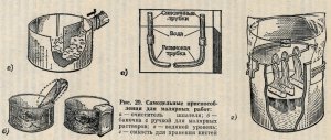 Если в вашей работе наступил перерыв, не оставляйте кисти долго на воздухе — они засохнут. На рис. 29 г показано, как можно хранить кисти даже несколько дней, если в банку налить немного керосина.