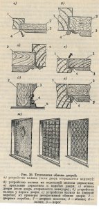 Несколько иначе действуют в случае, когда дверь открывается внутрь помещения (рис. 30 е). Полотнище дерматина выкраивают точно по размерам двери. Вместо трех выкраивают четыре полосы шириной 14 см и длиной соответствующей каждой стороне дверной коробки (1).