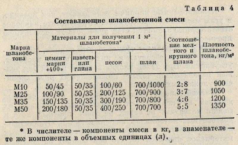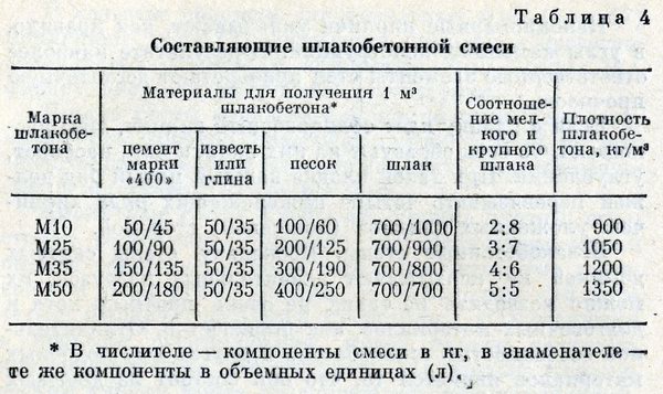 Котельные шлаки до употребления очищают от земли, глины, золы, несгоревшего угля и других посторонних включений. Прочность и теплопроводность шлакобетона во многом зависят от его гранулометрического состава, то есть от соотношения мелких (0,25—5 мм) и крупных (5—40 мм) частей шлакового заполнителя. При крупном шлаке бетон получается более легким, но менее прочным, при мелком, наоборот, более плотным и теплопроводным. Для наружных стен наилучшее соотношение мелких и крупных частей шлака составляет от 3:7 до 5:5. Для внутренних несущих стен мелкий шлак используют в большем количестве. Шлак фракцией, более 10 мм в состав бетонной массы перегородок вообще не включают. Для повышения прочности бетона примерно 30% шлака заменяют песком. В качестве вяжущего бетонной смеси используют портландцемент с добавками извести или глины, придающими смеси повышенную пластичность и удобство при укладке. Ориентировочный состав шлакобетонной смеси приведен в таблице 4.