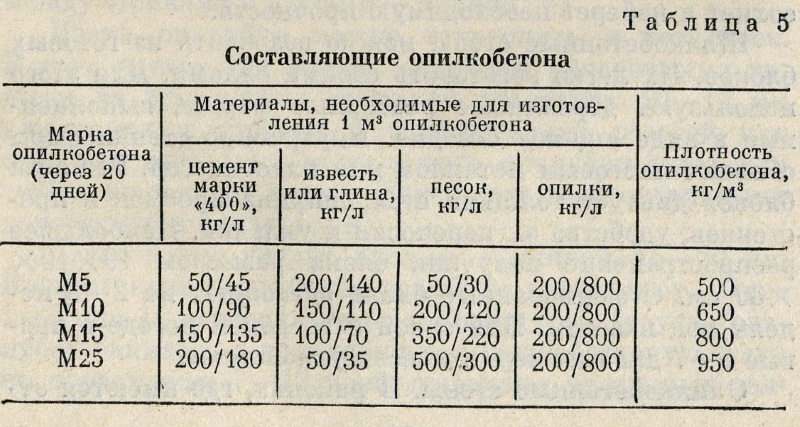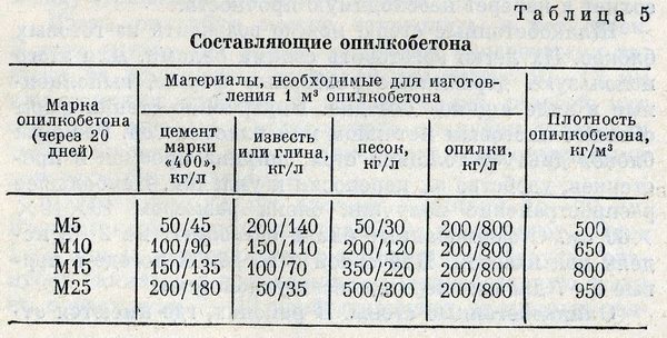 Опилкобетоцные стены. В районах, где имеются отходы лесоперерабатывающей промышленности, хорошими заполнителями легких бетонов могут быть древесные опилки. В смеси с вяжущим компонентом из них можно получить теплый и огнестойкий стеновой материал — опилкобетон. По теплозащитным качествам он эффективнее полнотелого кирпича, а по санитарно-гигиеническим показателям из всех бетонных материалов считается самым комфортным для жилых зданий. Однако стены из опилкобетоыа нуждаются в устройстве дополнительной изоляции от влаги окружающей среды. Для этого с наружной стороны стены штукатурят цементно-песчаным раствором или облицовывают кирпичом, с внутренней — обшивают досками, фанерой, древесноволокнистыми плитами и тому подобными изделиями. Между обшивкой и блоками прокладывают пароизоляцию (пергамин, синтетическую пленку). В качестве заполнителя блоков используют опилки деревьев хвойных пород, так как они мало подвержены биологическому распаду. Лучший вяжущий компонент для формирования опилкобетона — цемент. Для уменьшения расхода цемента часть его заменяют известью или глиной. Известны несколько рецептов изготовления опилкобетона. Все они зависят в основном от качества вяжущих компонентов и состава заполнителей. Главное требование - масса вяжущих компонентов должна быть не меньше сухой массы заполнителей. Например, если для получения бетонной смеси взято 20 кг опилок, то и цемента и воды в сумме должно быть не менее 20 кг. Повышения прочности и уменьшения усадки опилкобетона достигают, добавляя песок. Ориентировочный состав опилкобетона приведен в таблице 5.