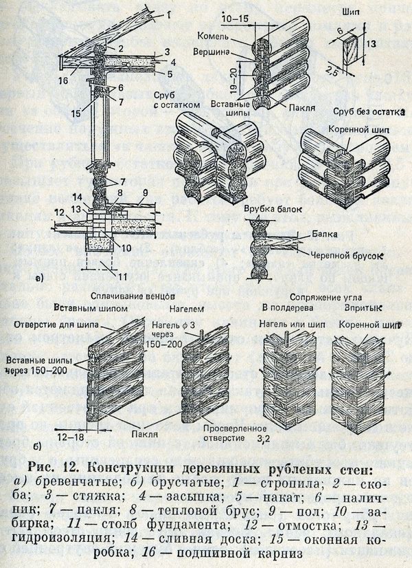 Рубку стен (рис. 12) начинают с кладки первого (окладного) венца. Бревна этого венца отесывают на два канта (плоскости): один с будущей внутренней стороны, второй — с той, что ляжет на фундамент. Ширина «нижнего» канта должна быть ее менее 15 см. Первый венец укладывают из более толсты» бревен строго по уровню, следующий соединяют с ним в паз, выбираемый на ширину не менее 12—15 см с нижней стороны каждого бревна. Для большей устойчивости стен венцы между собой скрепляют, кроме того, вставными шипами высотой 12—15 см, шириной 5 — 7 см и толщиной 2,5 см, располагая их через 1,5—2 м по длине и в шахматном порядке по высоте сруба. В простенках ставят не менее двух шипов на расстоянии 15—20 см от краев— это позволит избежать перекосов. Сруб желательно выкладывать сразу по всему периметру, причем бревна в него складывают попеременно комлями в разные стороны, чтобы выдержать общую горизонтальность рядов.
