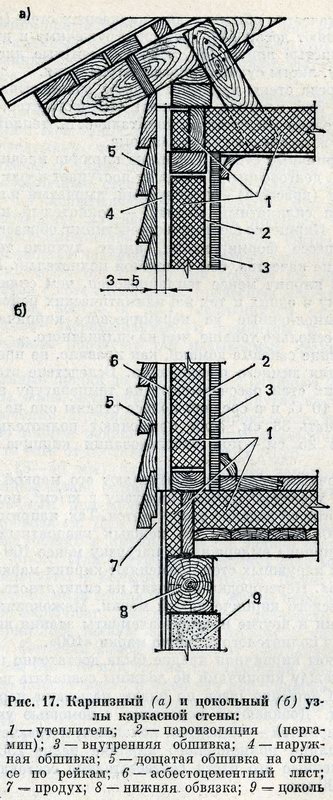 В качестве обшивки для каркасных стен (рис. 17) применяют доски (5), древесностружечные и древесноволокнистые плиты (3), асбестоцементные листы (6), фанеру, листы сухой гипсовой штукатурки.