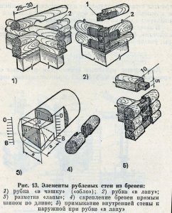 Узлы стен выполняют двумя способами (рис. 13). Первый из них называют рубкой с остатком («в чашку» или «в обло»), второй — без остатка, или «в лапу». Пересечение наружных стен с внутренними может также осуществляться «в чашку» или «в лапу» (сковороднем).