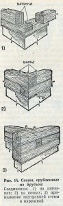 Сборка стен из брусьев (рис. 14) менее трудоемка и вполне под силу самодеятельному застройщику. По сравнению с бревенчатыми брусчатые конструкции, благодаря использованию отходов производства (горбыля), дают некоторую экономию древесины. Правда, брусчатые стены требуют устройства дополнительной защиты помещений дома от холода, дождя и ветра.