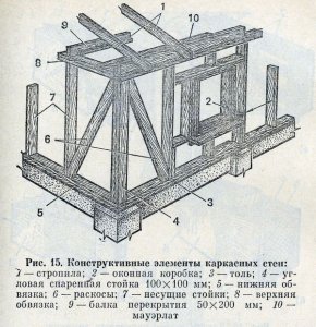 При обшивке каркаса досками или другими материалами, не обеспечивающими плоскостную (продольную) жесткость стен, необходима установка внутри каркаса дополнительных раскосов (6) (рис. 15)