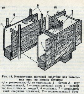 Шлакобетонные стены возводят, пользуясь переставной опалубкой. Ее делают из досок толщиной около 2 см (рис. 18), сбитых в щиты (2). Щиты опалубки крепят к неподвижным стойкам (5) толщиной 10—15 см. Стойки устанавливают с двух сторон возводимой стены с промежутком 1 —1,5 м и сверху распирают горизонтальными распорками (4) или стягивают стержнями (7). Внутрь щитов вставляют временные распорки, а между стойками и щитами — клинья (6).