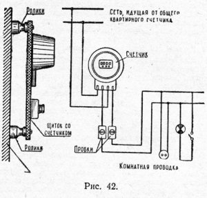 Установка счетчика не вызывает затруднений. Щиток со счетчиком надо установить на четырех роликах (по углам щитка) в комнате вблизи того места, откуда проходит электропроводка от общего квартирного счетчика. Присоединять счетчик нужно по приводимой схеме (рис. 42).