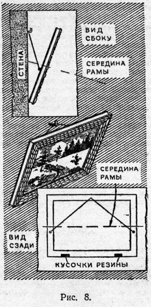 Картину можно повесить и на одном гвозде или костыле. Для этого следует поступить так. На вертикальных планках рамы с обратной стороны нужно найти середину и затем отступить вниз примерно на одну пятнадцатую длины вертикальной планки (рис. 8). В отмеченных местах надо укрепить бечевку и затем отрегулировать ее длину, которая примерно должна быть равна размеру рамы по диагонали. Иными словами, прикрепленная бечевка в натянутом положении не должна выходить за край верхней планки рамы. После этого картину следует повесить на гвоздь или на костыль. Так как верхняя часть картины (если считать от мест прикрепления бечевки) тяжелее нижней, то картина будет висеть под некоторым углом к стене.