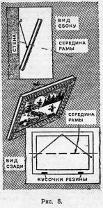 К обратной стороне нижней планки рамы можно прикрепить кусочки резины, тогда картина будет держаться на стене еще лучше. Если все сделано правильно, то по желанию можно придавать картине любой наклон: она так сбалансирована, что останется в любом положении. Резина на нижней планке рамы необходима не только для лучшего сцепления со стеной, но и для того, чтобы между рамой и стеной оставалась щель. Тогда на обратной стороне картины, благодаря циркуляции воздуха, будет оседать гораздо меньше пыли.
