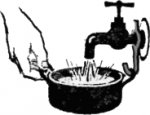 При починке белых и легких тканей клеем БФ-6 можно пользоваться только в тех случаях,когда заплатка ставится в скрытых от глаза местах, поскольку линии склейки обычно несколько желтеют. Заплату лучше прикреплять с изнанки, поэтому ремонтируемую вещь перед починкой вывертывают, чистят щеткой, подрезают нитки и неровности и подгоняют заплату. Место починки и заплату смачивают теплой водой и отжимают. Затем на края отверстия и заплаты наносят тонкой жесткой кистью клей, дают ему просохнуть до такого состояния, когда он уже почти не будет прилипать к пальцу, опять смазывают и, снова дав подсохнуть, аккуратно накладывают смазанные края заплаты на смазанные края ремонтируемой вещи так, чтобы не было морщин и перекоса. После этого покрывают заплату влажной бумажной тканью и два-три раза прижимают на несколько секунд умеренно горячим утюгом. Эту операцию повторяют с перерывом в 15—20 секунд, пока склейка не просохнет окончательно. Заплаты, сделанные при помощи клея БФ-6, очень прочны.