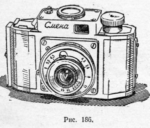 Наконец, имеет значение и стоимость фотоаппарата, а также расход на фотоувеличитель. Наиболее дешевы фотоаппараты «Любитель» (рис. 185) и «Смена» (рис. 186).