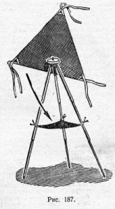 Ножки штатива не разъедутся в стороны, если их связать между собой концами треугольного куска материи, к которым пришиты завязки (рис. 187). На треугольник можно также класть кассеты, светофильтры и т. п. Если ветрено и штатив покачивает, для устойчивости надо положить на треугольник груз — камень и т. д. В этот же кусок материи можно завертывать и штатив.