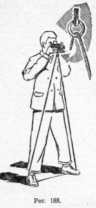 Для другого варианта веревочного штатива берется отрезок шпагата или тонкого гибкого проволочного шнура длиной от 3 до 4 м (подходящая для каждого случая длина зависит от роста фотолюбителя и уточняется затем практически). Оба конца отрезка связываются вместе, образуя кольцевой веревочный штатив, который прикрепляется к фотоаппарату посредством колечка (или крючка, если желательно быстрее освободиться), снабженного нарезкой для штативного гнезда камеры или футляра. Для съемки фотограф наступает в нижнюю часть веревочного кольца обеими ногами, расставив их примерно на 50 см, аппарат сильно подтягивает кверху и прижимает к телу камеру («Любитель») или локти (при съемке «Москвой» или малоформатным аппаратом). Такой штатив (рис. 188) дает повышенную устойчивость и допускает выдержки до 1/2 секунды.