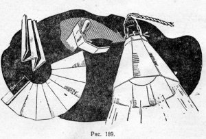 При съемках с искусственным освещением (электролампами и вакуумными фотовспышками) целесообразно применять рефлекторы-отражатели. Они значительно повышают эффективность искусственного освещения, защищают объектив и глаза фотографа от прямых лучей света. Образец складного портативного рефлектора из плотной бумаги приведен на рисунке 189. В петли на нижней части рефлектора продевается шнурок, который затягивается после надевания (при вывинченной лампе) прибора на электропатрон. Для прочности сгибы рефлектора можно оклеить тонкой тканью. Если материалом для рефлектора служила цветная бумага, то внутреннюю сторону его нужно оклеить белой бумагой или алюминиевой фольгой.