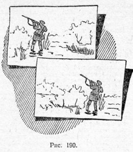 Действие (или движение) должно стремиться не за пределы снимка, а внутрь его. Охотника, стреляющего влево, помещайте не в левой же части снимка, а в правой его половине (рис. 190). Для этого достаточно немного повернуть объектив влево. То же самое касается любого движущегося объекта: свободное пространство надо оставлять перед ним, а не позади него (исключение— бегун у финиша).