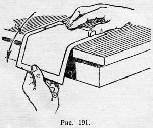 Высохшие (без наката) фотоотпечатки склонны коробиться, на них появляются как бы вмятины и выпуклости. Для выпрямления отпечаток следует положить (лицевой стороной кверху) на прямоугольный стол и, перегнув его через край стола, протянуть вниз два-три раза, прижимая сверху к столу двумя-тремя пальцами (рис. 191). Отпечаток слегка выгнется в другую сторону. То же надо повторить в перпендикулярном направлении отпечатка. Затем отпечаток кладут на несколько часов под пресс (например, в книгу). Ребро стола должно быть совершенно гладким, без малейших неровностей, которые оставили бы след на отпечатке. Перегибание отпечатков на глянцевой бумаге не должно быть резким во избежание трещин на фотослое.