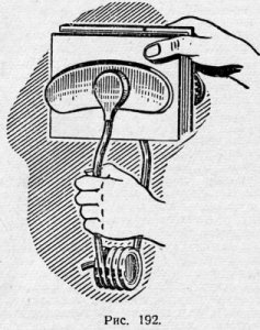 В качестве пресса для высохших отпечатков можно использовать пружинные зажимы осветительного прибора Ф-1, поместив в них отпечатки между двумя листами толстого картона не меньше чем на час (рис. 192).