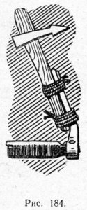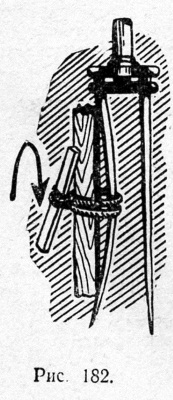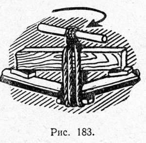 Повертывая шестерню кругом, можно без труда определить, достаточно ли она выправлена. Если по той или иной причине погнулось одно из «перьев» передней вилки, его нетрудно выправить следующим способом. Сбоку к «перу» привязывают деревянный брус, например небольшое полено, чтобы концы его упирались в непогнутую часть «пера», а веревка находилась как раз в месте прогиба. Затем, подсунув под веревку небольшую прочную палку, закручивают веревку, усиливая этим напряжение и постепенно выправляя «перо» (рис. 182).