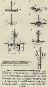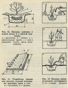 Посадка плодовых деревьев. Способы посадки деревьев и кустарников, выбор необходимых для этого приспособлений и орудий зависят от размера и возраста посадочного материала. Обычно высаживают деревья в возрасте 1 — 3 лет — это саженцы с оголенной корневой системой. Если же плодовым деревьям и их декоративным формам более пяти лет, то их нужно пересаживать с комом земли в мягкой упаковке из мешковины или рогожи.