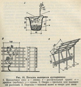 Посадка вьющихся кустарников производится в ямы глубиной 40 см, на дно ямы насыпается слой щебня или битого кирпича толщиной не менее 15 см (рис. 16). Лианы предпочитают рыхлую питательную землю с систематическим внесением удобрений и частым поливом.