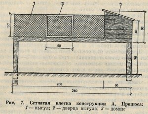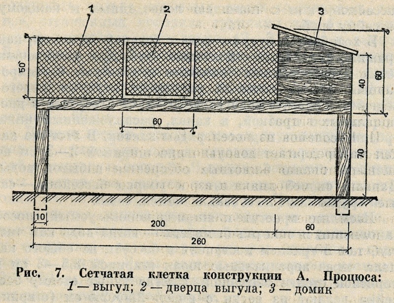 Избежать этих недостатков помогает содержание нутрий в сетчатых клетках. На рис. 7 изображена конструкция, которой много лет с успехом пользуется житель Мажейкского района Литовской ССР А. Процюс. Клетка состоит из домика и выгула, установленных на высоте 70—80 см. Домик сооружают из двух слоев шпунтованных досок с прокладкой из толя; стены домика обивают сеткой или листовым металлом. Пол делают цементным, толщиной 3—5 см, Крышу домика навешивают на шарнирах.