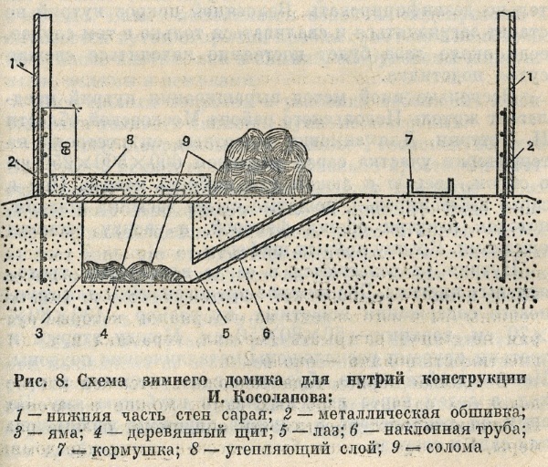 И. Косолапов из поселка Волжский Куйбышевской области предлагает довольно простой и недорогой способ выращивания животных, обеспечивающий хорошую сохранность молодняка и взрослых особей в самые лютые морозы. Суть его заключается в том, что в простеньком, ничем не утепленном сарайчике, сколоченном из имеющихся под рукой материалов, выкапывают яму глубиной 50—60 см и в ней устраивают домик (рис. 8). Место для сарая лучше выбрать на песчаной почве с залеганием грунтовых вод не менее чем на метровой глубине. Нижнюю часть стен сарая обшивают по периметру металлической сеткой или кровельным листовым железом на высоту 60--70 см от забетонированного пола.