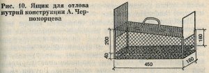 Корпус ящика делается из металлической сетки. С обоих торцов необходимо устроить поднимающиеся шторки, а можно и дверцы, кому как удобней, причем входная по высоте должна быть на 40 мм меньше выпускной, что придаст ящику конусообразный вид. Остальные технологические детали приспособления показаны на рисунке.