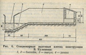 Нутриеводами-любителями разработаны различные конструкции клеток. Так, стационарная наземная клетка конструкции горьковчанина В. Кулешопа (рис. 6) состоит из домика (гнезда), выгула (берега) и бассейна (водоема). Для строительства клеток можно использовать различные материалы: цемент, кирпич, доски, металлические листы, пруты. Из бетона изготовляют стенки домика, выгула и пол в клетке, стенки выгулов и домиков можно сделать и из красного кирпича (как более прочного) с последующим оштукатуриванием. Домики должны быть сухими и теплыми, без щелей во избежание сквозняков.