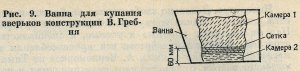 Житель Костопольского района Ровенской области В. Гребень решил эту задачу довольно просто. Он сконструировал и изготовил для водных процедур своих подопечных специальную емкость (рис. 9). Вода в камере 1, являющейся бассейном, долго остается чистой за счет того, что отходы, проходя через металлическую сетку в камеру 2, оседают на ее дне и при плавании нутрий не взбалтываются. Это позволяет заново наполнять емкость лишь раз в два дня.
