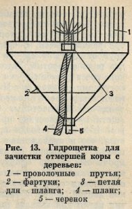 При уборке сада много времени и сил уходит на зачистку деревьев от отмершей коры — ее отдирают скребками и остатки побелки, пыль попадает в лицо. Чтобы избежать этого, В. Оппоков из Днепропетровска изготовил гидрощетку (рис. 13), к которой во время работы по тонкому шлангу подается вода, смывающая грязь. Основой гидрощетки послужила металлическая пластина 50 X 3 см. Автор конструкции разметил ее на три равные части. В средней, рабочей, на расстоянии друг от друга 1 см — в шахматном порядке пробил два ряда отверстий. Затем от четырехжильного стального троса отрубил куски по 4 см, каждый согнул плоскогубцами, придав ему П-образный вид, и вставил концами в верхнее и нижнее отверстия рабочей части металлической пластины. Со стороны образовавшейся «щетины» к пластине прибил тарную дощечку размером 16 X 4 см (гвозди пропускал через те же отверстия, что и проволочные пучки). Получилось подобие щетки. Её Оппоков насадил на черенок, для большей прочности стянув «фартуками» — отогнутыми боковыми частями той же металлической пластины. Место соединения «фартуков» с черенком окольцевал жестяной лентой; к ней, а также к тарной дощечке привинтил петли для захвата шланга. Наконец, проволочную «щетину» подровнял кусачками, для молодых деревьев оставив ее подлиннее (15 см — тогда она мягче), для старых — покороче. Такой гидрощеткой легко обрабатывать ствол и основные ветви на высоте 2 м и более. Ею же можно очищать от листьев грядки, газоны, цветники.