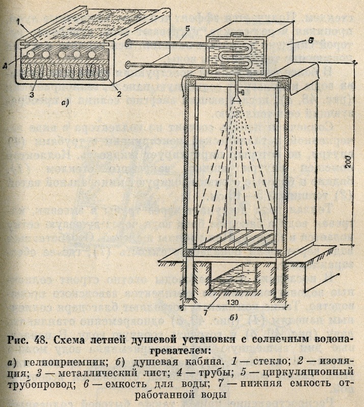 В более совершенной конструкции душа для нагрева воды используют солнечную панель, гелиоприемник (рис. 48, а), поглощающий энергию солнца и преобразующий ее в тепловую.