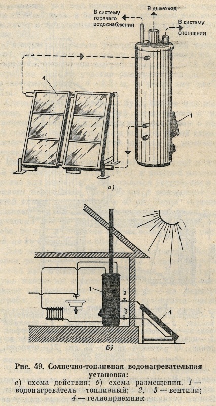 В последние годы садоводы охотно строят солнечные водонагреватели из комплектов заводского производства. Такие комплекты позволяют благодаря солнечным панелям (4) (рис. 49, а) одновременно отапливать дачу (рис. 49, б) и готовить горячую воду. В ненастные дни вышедшую из гелиоприемника воду можно догреть в котелке (1), работающем на дровах или угле. Таким образом, установка становится всепогодной.