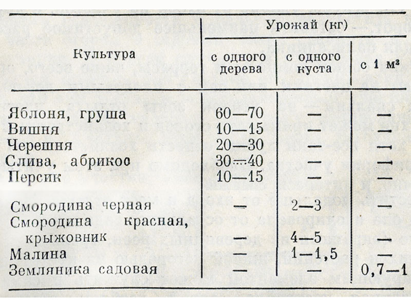 Среднюю урожайность плодовых и ягодных культур в килограммах для средней полосы европейской территории СССР приводим ниже.
