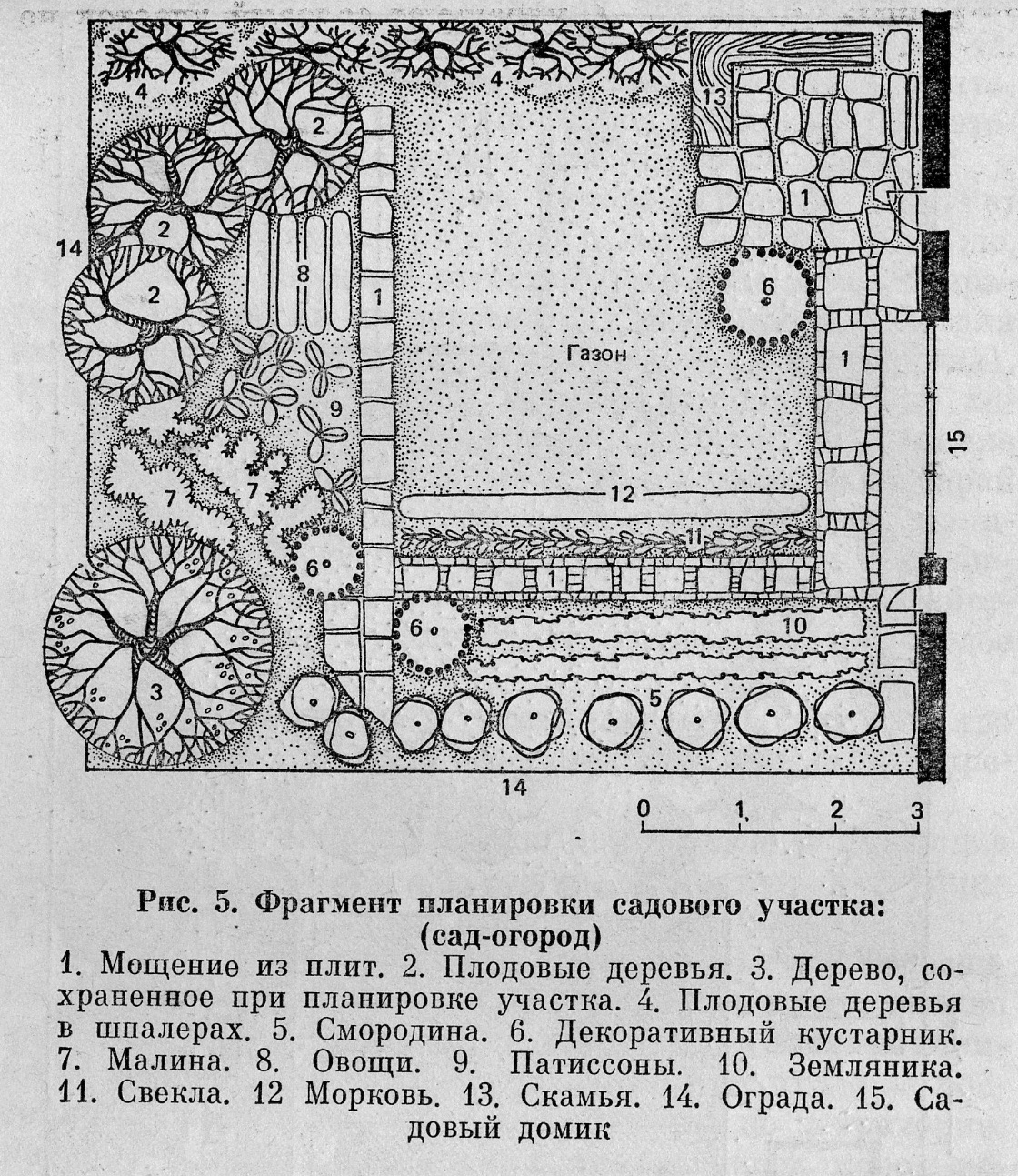 Но у хорошего хозяина аккуратно выполненные и ухоженные огородные грядки порой украшают садовый участок не меньше, чем цветник. К тому же известны приемы, когда цветочные культуры выращивают вместе с овощными, добиваясь при этом немалого декоративного эффекта (рис. 5). Приблизительно так должен выглядеть окончательный чертеж плана вашего участка, по которому вы сможете осуществить его планировку в натуре.