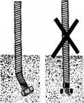 Похожую подставку для томатов смастерил М. Галимов из г. Октябрьского Башкирской АССР. Он взял стальную проволоку с антикоррозийным покрытием диаметром 6 мм и длиной 1,1 м. Часть ее согнул кольцом с радиусом 5 см, оставив разрыв между его концами величиной 3—4 см. Оставшуюся часть проволоки изогнул перпендикулярно плоскости кольца. Образовавшийся штырь Галимов загоняет в почву вплотную к кусту томата, просовывая аккуратно стебли растения через зазор кольца. По мере роста культуры штырь поднимают из земли на нужную высоту.