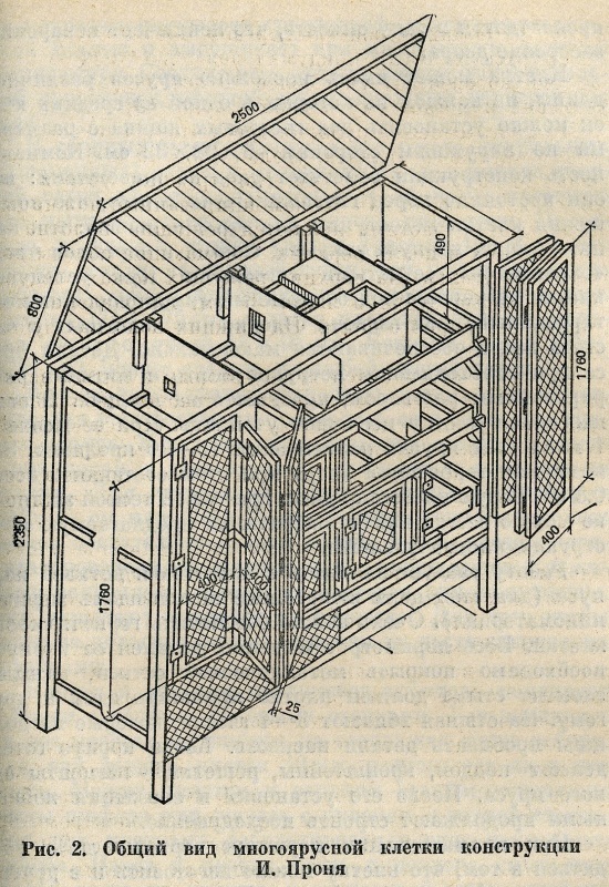 Многоярусная клетка. Для любителей, имеющих небольшой хозяйственный двор, наиболее подходящей будет клетка, сделанная краснодарцем И. Пронем (рис. 2). Она очень удобна прежде всего тем, что ее обитаемая площадь в 2,5 раза больше занимаемой. Клетка разделена на 12 ячеек, каждая площадью около 0,4 м2. Конструкция допускает большую мобильность в Желаемой перестройке путем перестановки перегородок. Сбор отходов происходит на поддонах, слив фекалий производится в одну емкость, что исключает испарение, засорение двора.