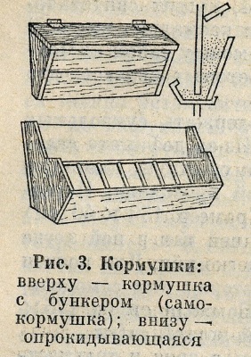 Инвентарь. Для кормления кроликов концентрированными кормами и поения обычно применяют круглые глиняные или пластмассовые емкости. На каждое взрослое животное их следует иметь две: одну — для корма, другую — для воды. Используют и деревянные кормушки, которые обычно устанавливают на дверках кормового отделения (рис. 3). Очень удобны бункерные кормушки для гранулированного корма или зерна, рассчитанные на 3—5-дневный запас кормов. Корм самотеком поступает из бункера в кормовой лоток длиной 30 см, разделенный перегородками. Перегородки и специальная форма кормового лотка не позволяют животным выгребать корм. Кормовой лоток можно изготовить из листовой стали толщиной 0,07—0,08 мм, он крепится на клетку с помощью крючка и оси, относительно которой лоток может поворачиваться для очистки.