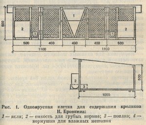 Одноярусная клетка. Оригинальную конструкцию одноярусной клетки разработал житель Пензы Н. Бровкин (рис. 1). Состоит она из двух отделений, в каждом из которых может находиться самка с приплодом или 16—18 голов отъемного молодняка.