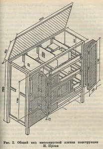 Работу следует начинать с подготовки деталей корпуса (для этой цели желательно использовать мерный пиломатериал). Очень важно обеспечить герметичность клетки. Весь периметр стыкуемых деталей ее корпуса необходимо покрыть металлической сеткой, каждый элемент стыка должен плотно прилегать один к другому. На стыках вбивают 3—4 гвоздя, которые не должны пробивать детали насквозь. Когда корпус готов, делают поддон, кронштейны, решетки — элементы одного яруса. После его установки и заселения животными продолжают строить последующие.