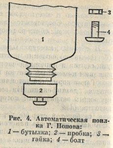 Своеобразную автоматическую поилку придумал астраханец Г. Попов (рис. 4). Пусть вас не пугает слово «автоматическая», конструкция очень проста в изготовлении. В клетке подвешивается бутылка с водой вниз горлышком. Пробка с клапаном, который благодаря созданному в емкости вакууму без усилия воду не пропускает. При незначительном нарушении покоя клапана пузырьки воздуха устремляются в бутылку и вытесняют несколько капель воды. Кролик, обнюхивая бутылку (но своей природе это очень любознательное животное), слизывает выступившую на клапане воду, вызывая тем самым появление новых капель. И так до тех пор, пока не удовлетворит жажду. Бутылки для поилки пригодны любые, но удобнее те, у которых на горлышке есть резьба.